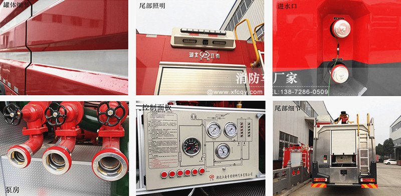 駕駛室頂部前端為長排警燈,車身后配有24V/60W火場照明燈一只,車輛兩側上方各配有紅藍相配的爆閃燈,下方安裝安全標志燈,乘員室、器材箱、 泵房內均裝有照明燈,加裝有100W警報器,回轉警燈開關、通訊設備預備接口。